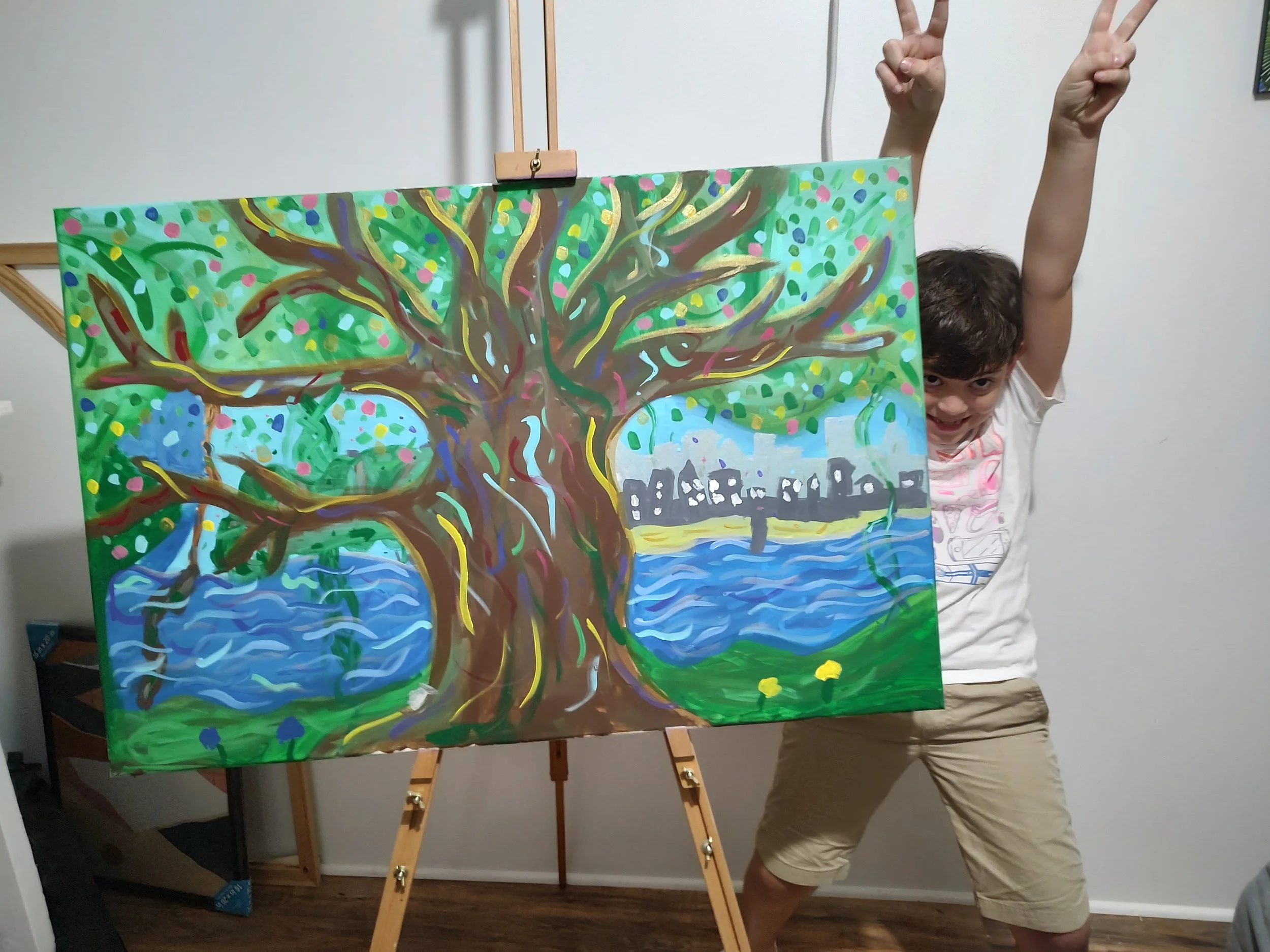 My children have been joining me in the art studio a lot lately and my oldest, Riah, age 9, was set on us painting a tree goddess. Normally, I don’t let the kiddos help me with big canvases, but this child was empowered and inspired to join mama!